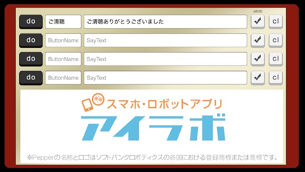 | 主な機能 | ・Pepperを簡単に操作できる。 (移動、首・腰を動かす、音量調整、発話、その他) ・発話内容の設定も簡単 ・動作内容は関節コントロールして6つのポーズを 組み合わせた動作が可能 ・レトロゲーム機テイストの親しみやすいデザイン |